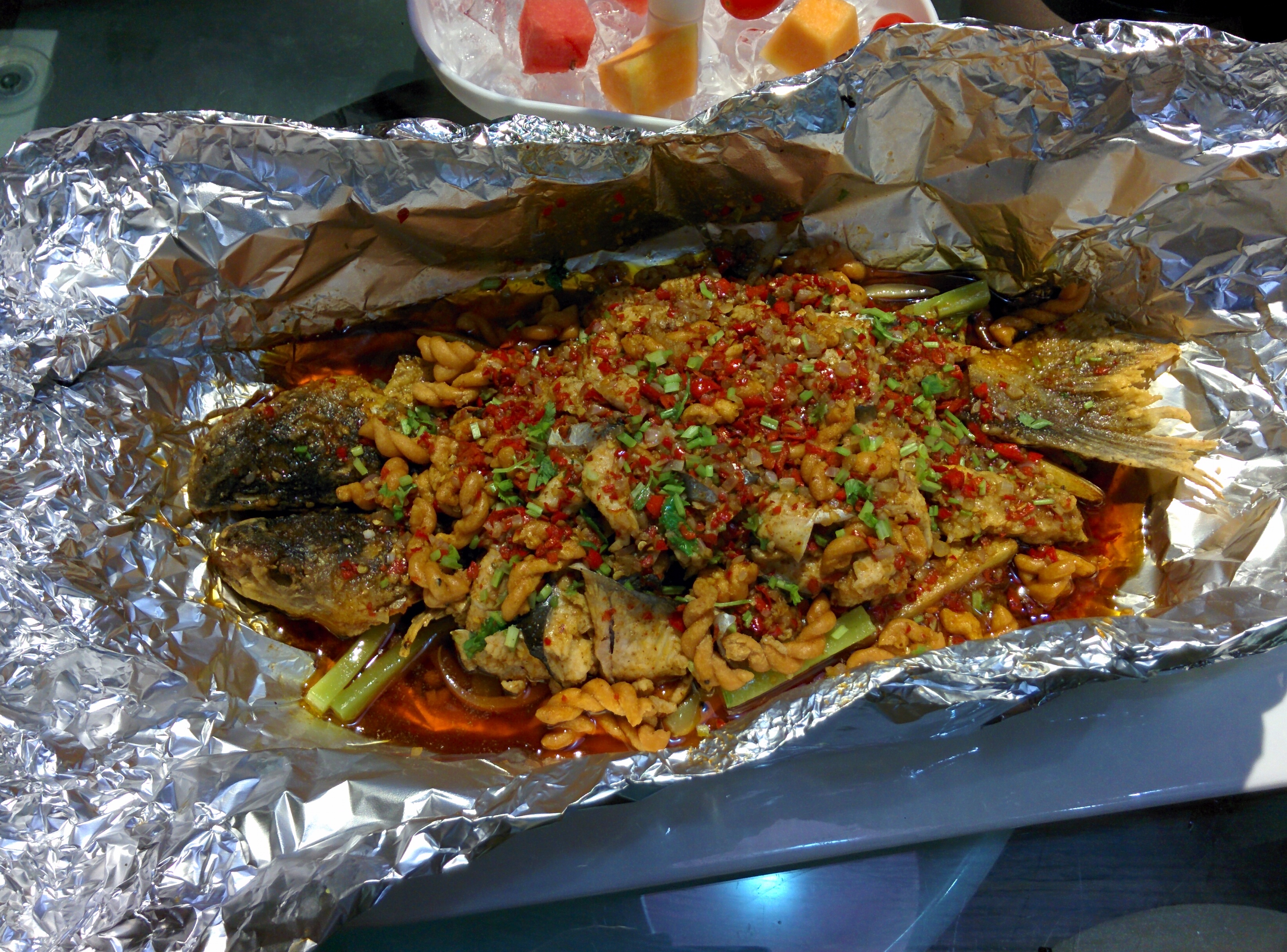 The centerpiece of our meal — a huge, spicy fish!